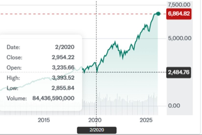 Like the market in 2020, 2022-2023, and 2025, we have seen major corrections, and none were predicted in their entirety. And although those periods are hard to tolerate, the key focus is to remain disciplined. Because the recovery and the “Stayin’ Alive” vibe is what makes a long-term plan stay on track. Below is a simple illustration of the S&P 500 Index from 2/20/20 to 2026 YTD. 1